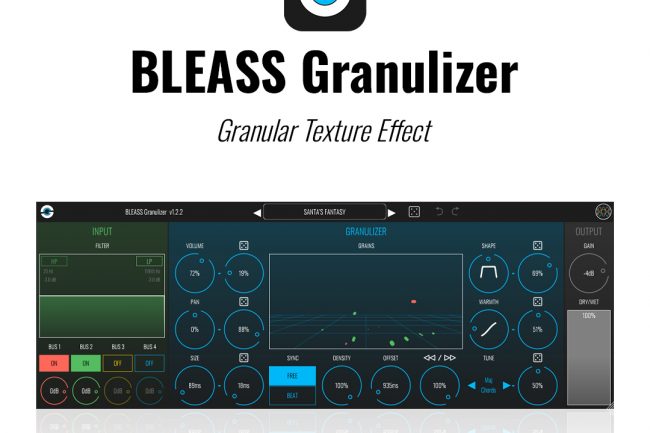 BLEASS Granulizer is a granular texture effect plugin with randomization, 4 multi-bus audio inputs and a mesmerizing 3D visualizer. More info on https://www.bleass.com/granulizer/