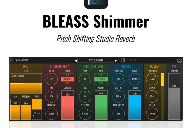 Unique Pitch Shifting Reverb emphasizing harmonics and adding a smooth and pleasing reverb trail to any sound! Clean and flexible UI, Pro quality Shimmer More info on https://www.bleass.com/shimmer